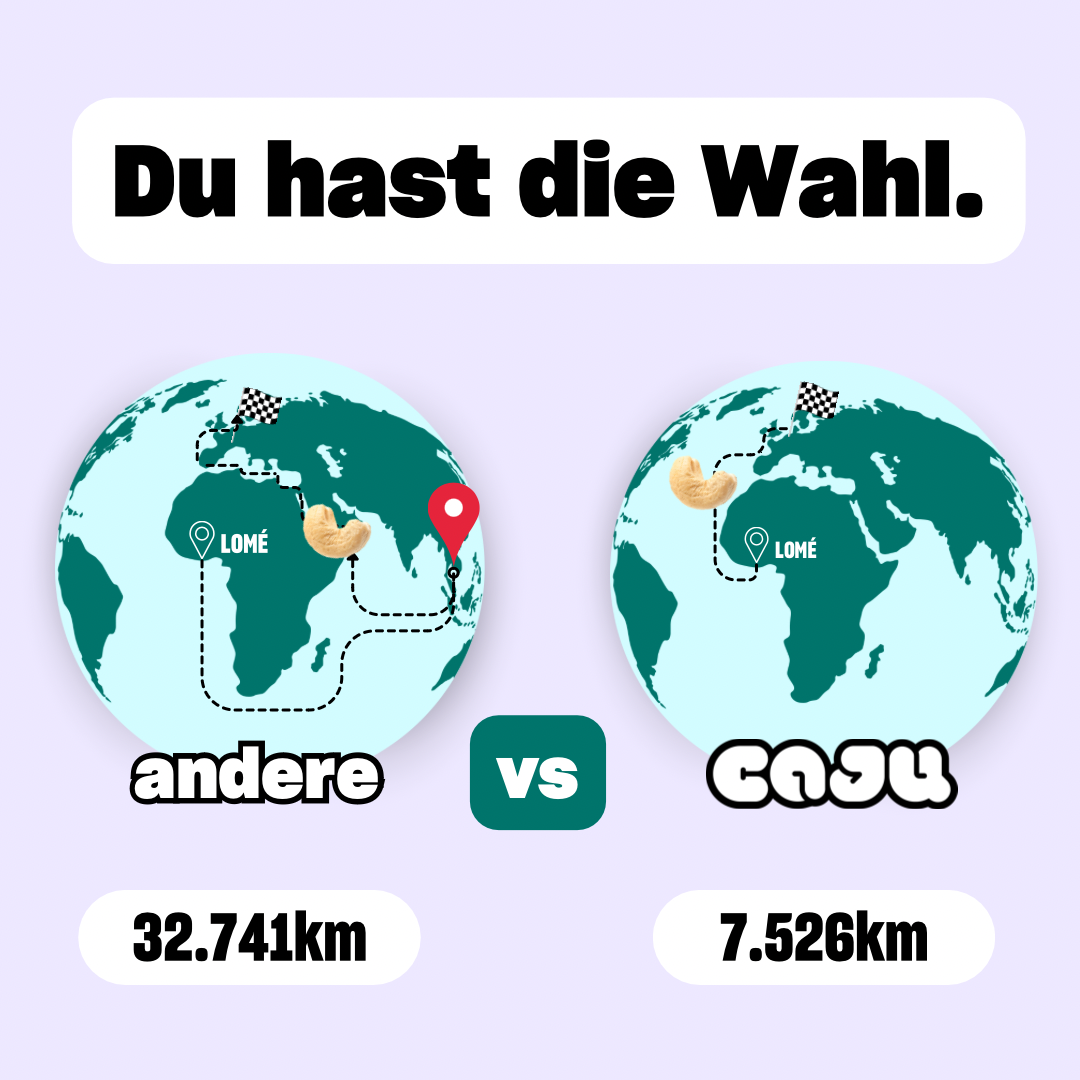 Mit deinem Kauf unterstützt du die faire Cashew-Produktion in Afrika und sorgst für direkte Lieferketten. Das ist gut für die lokale Wirtschaft, sorgt für existenzsichernde Löhne und spart tonnenweise CO2, weil der Umweg über Asien wegfällt.